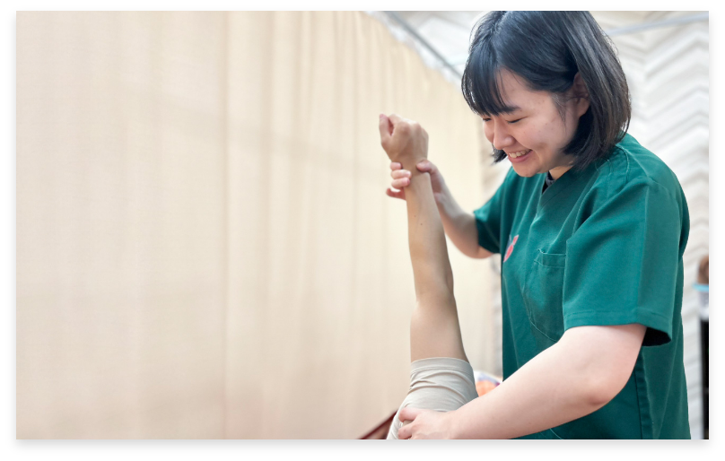 女性スタッフとして、細かな気配りを忘れずに、親身になって施術、コミュニケーションをとることを大切に考えています。疼痛緩和、関節の可動域改善の2つを大きく意識して常に考え行動しています。笑顔になってもらうように全力で施術します。